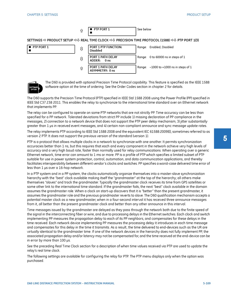 The D60 supports the Precision Time Protocol (PTP) specified in IEEE Std 1588 2008 using the Power Profile (PP) specified in