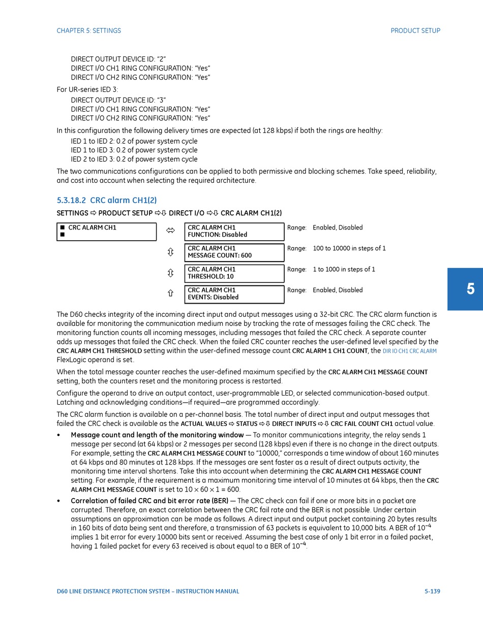The D60 checks integrity of the incoming direct input and output messages using a 32-bit CRC. The CRC alarm function is