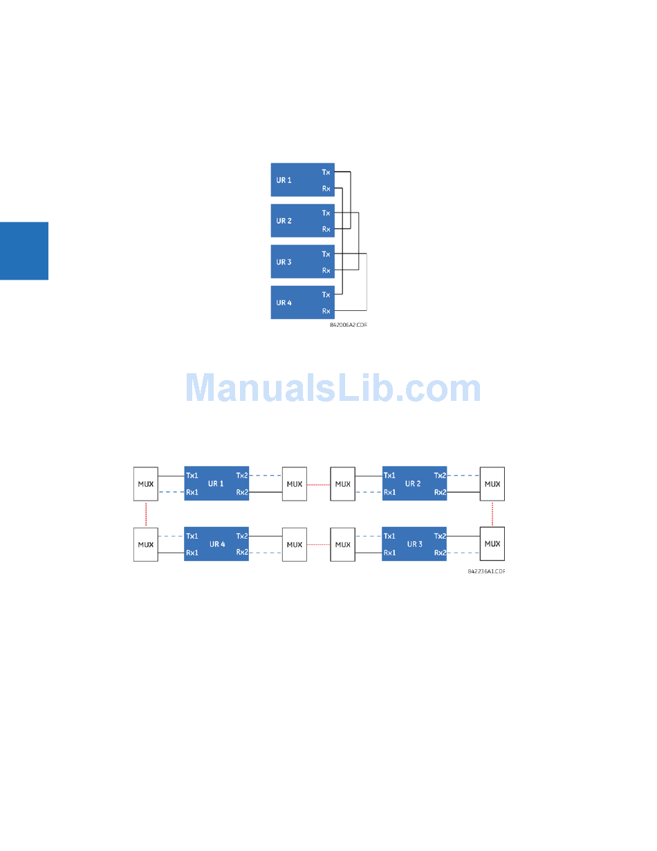 illustrates a ring of four UR-series relays with the following connections: UR1-Tx to UR2-Rx, UR2-Tx to UR3-Rx, UR3-Tx to