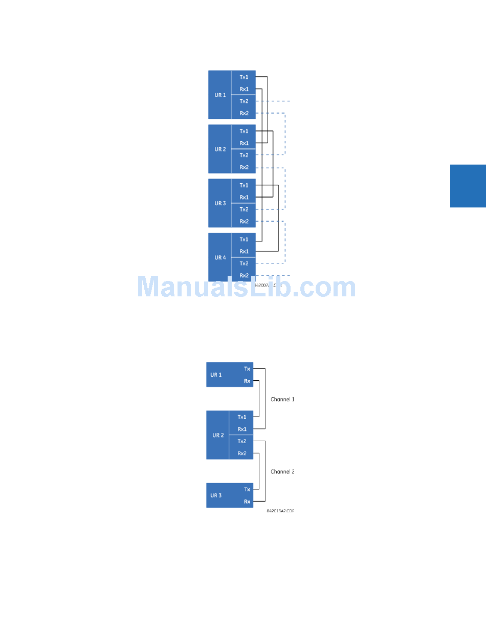 The following diagram shows the connection for three UR-series relays using two independent communication channels.