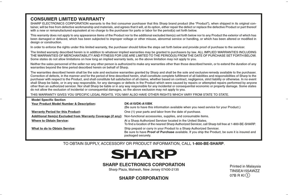 The warranties described herein shall be the sole and exclusive warranties granted by Sharp and shall be the sole and exclusive remedy available to the purchaser.