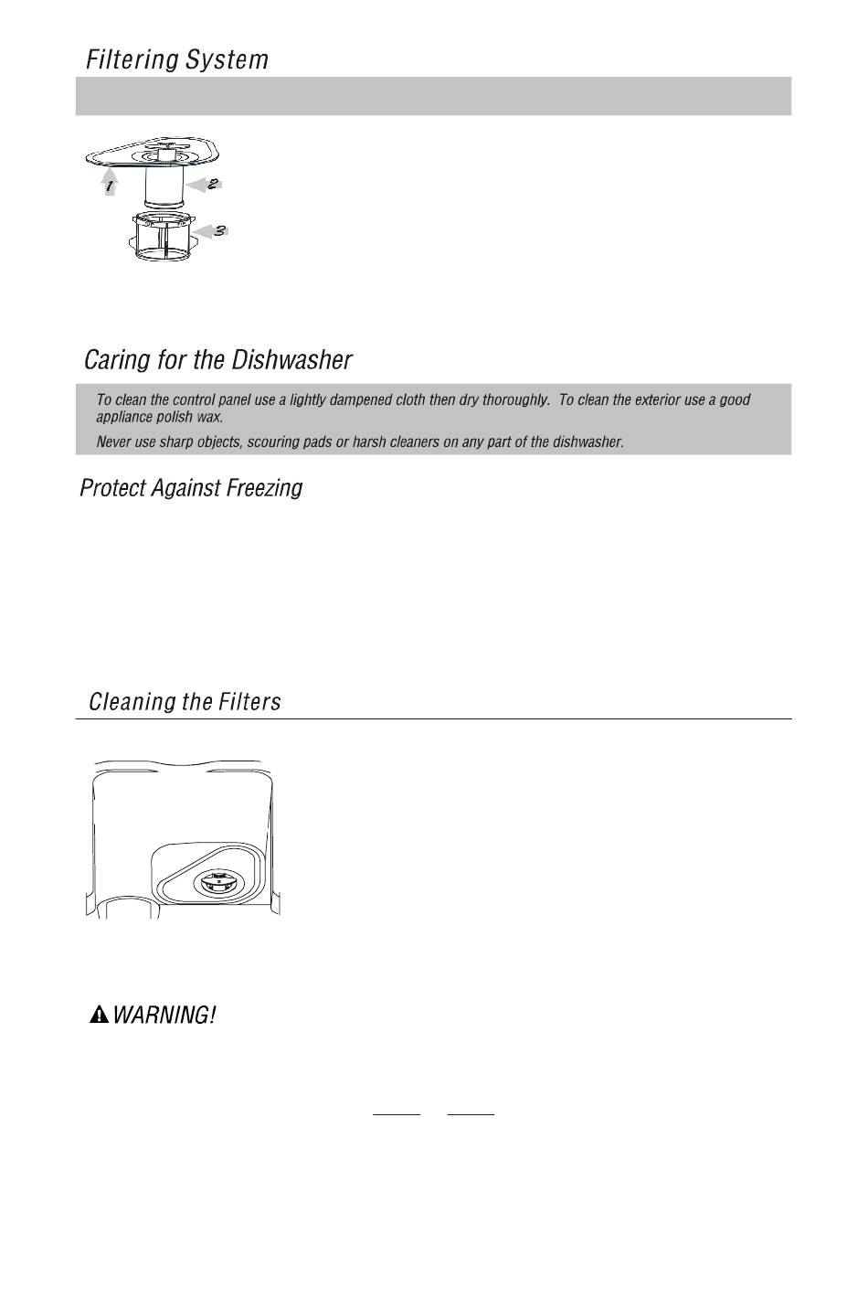 The dishwasher must never be used without the filters. Improper replacement of the
