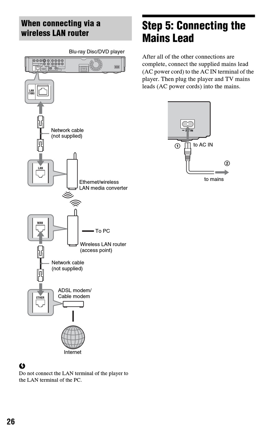 Do not connect the LAN terminal of the player to