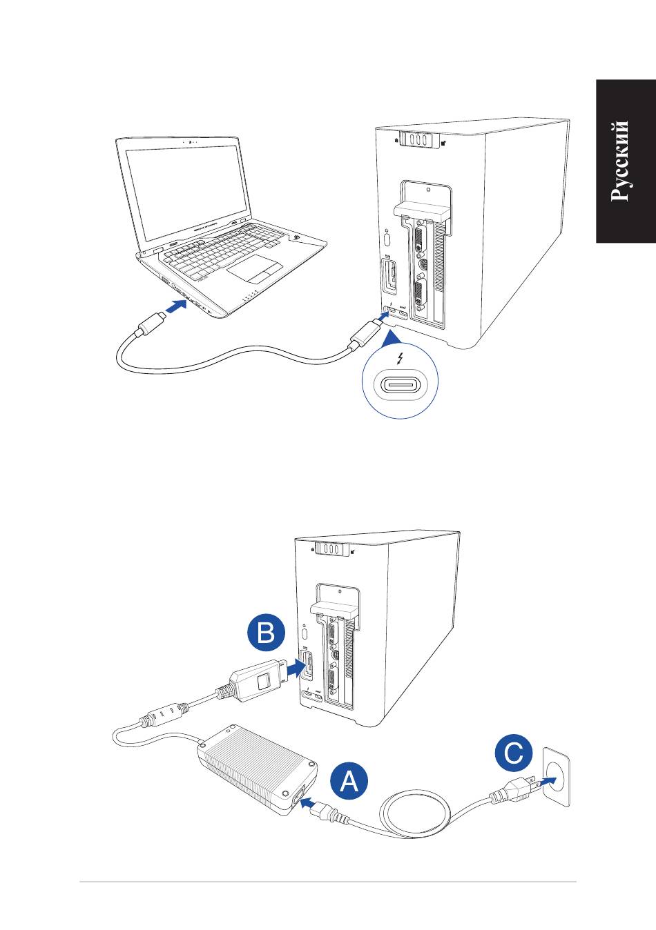 Подключите идущий в комплекте кабель Thunderbolt 3 тип-C к ноутбуку и XG Station PRO.