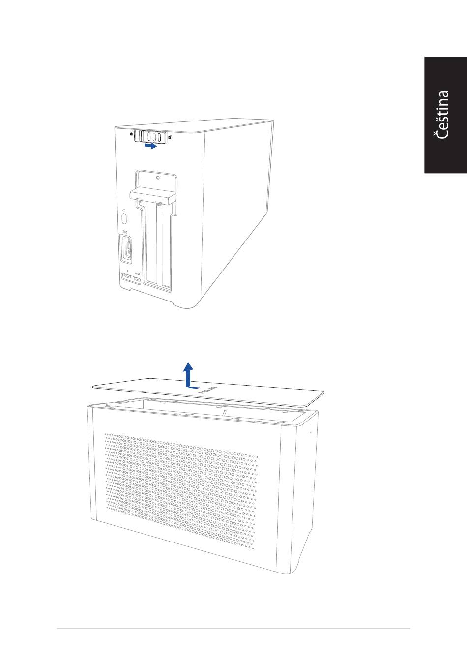 Posuňte horní kryt směrem do zadní části XG stanice PRO, poté zvednutím horní kryt otevřete.