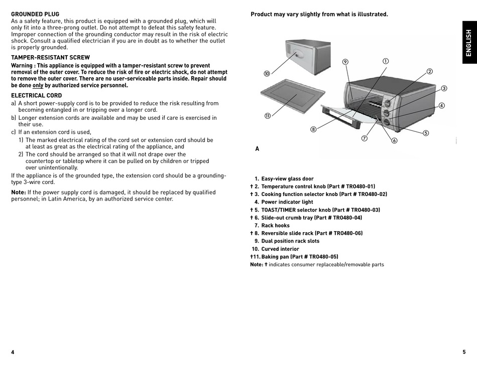 † 6. slide-out crumb tray (part # tro80-0)