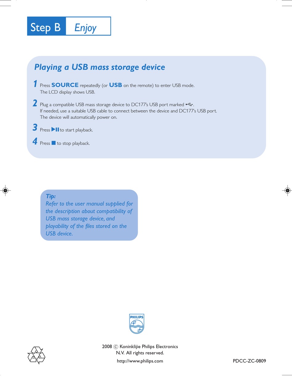 Plug a compatible USB mass storage device to DC177's USB port marked