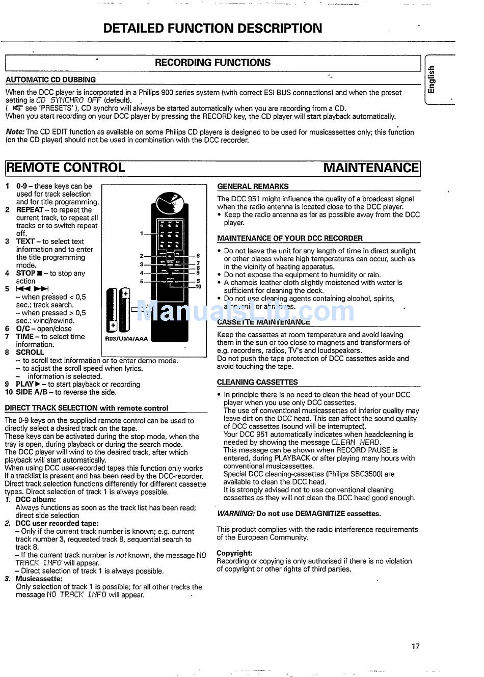 Remote Control; Maintenance; Automatic Cd Dubbing; Direct Track Selection With Remote Control - Philips Dcc951/17S Instructions For Use Manual