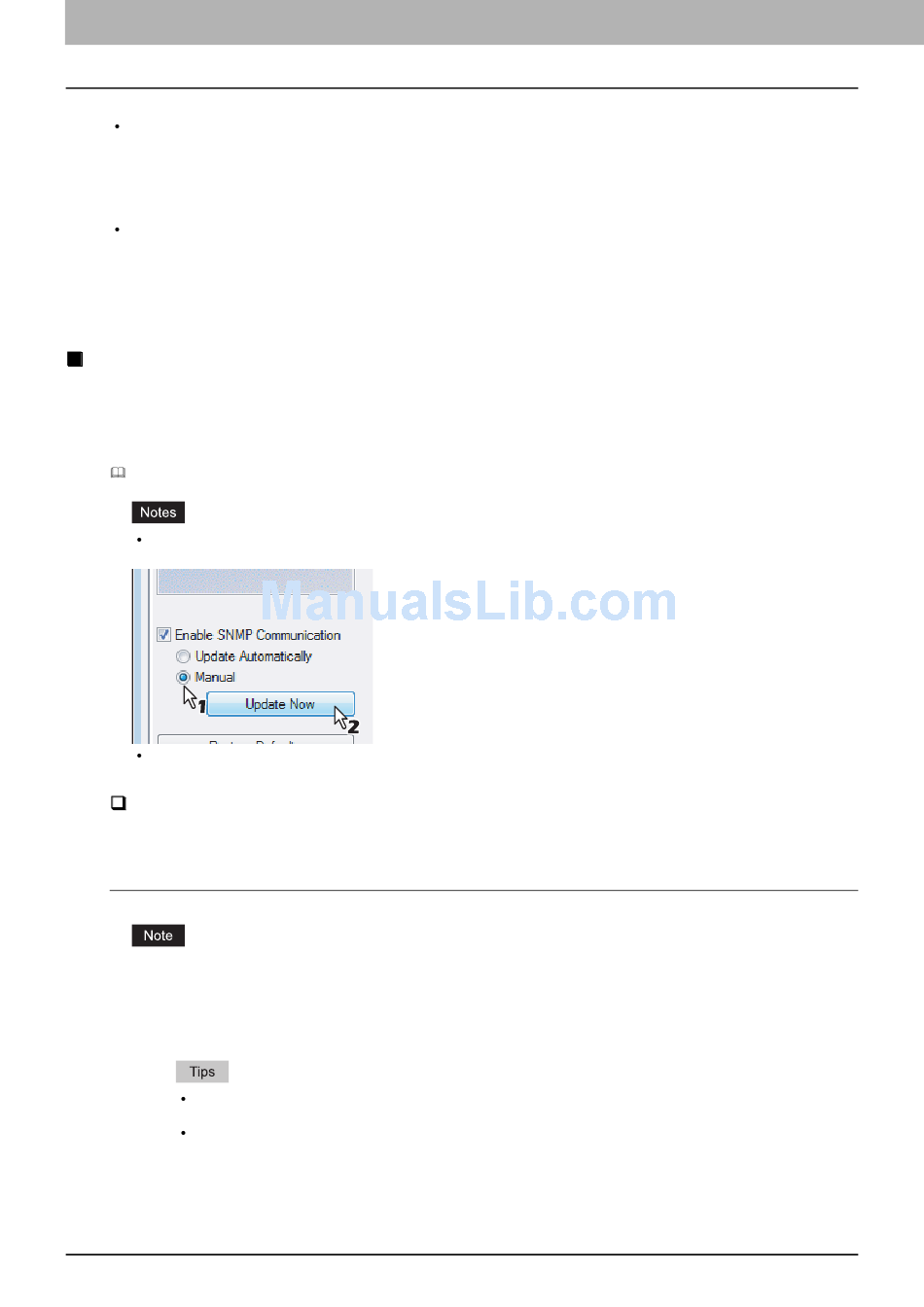 If available, select [Manual] of [Enable SNMP Communication] check box on the [Configuration] tab menu, and