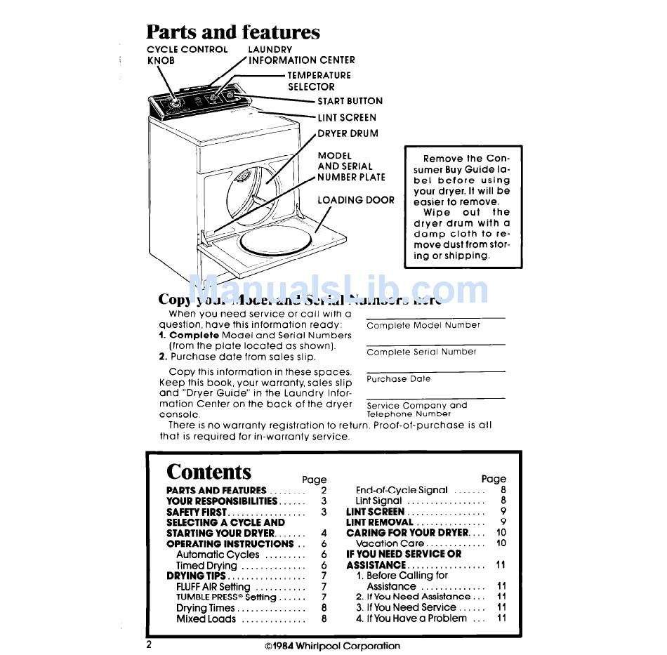 STARTING YOUR DRYER. ......