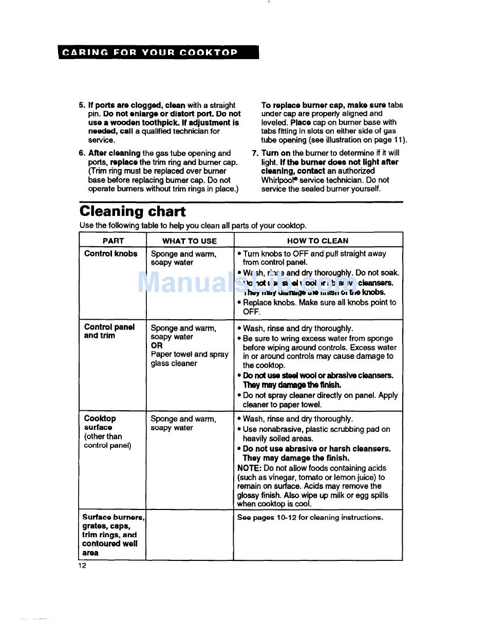 Use the following table to help YOU clean all P arts of your cooktop.