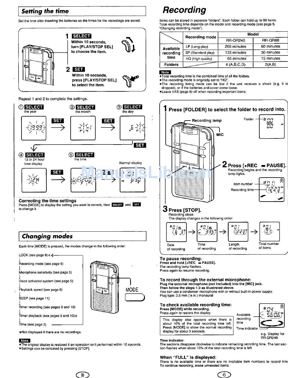 Changing Modes; Recording; Setting The Time; To Record Through The External Microphone - Panasonic Rr-Qr240 Operating Instructions Manual