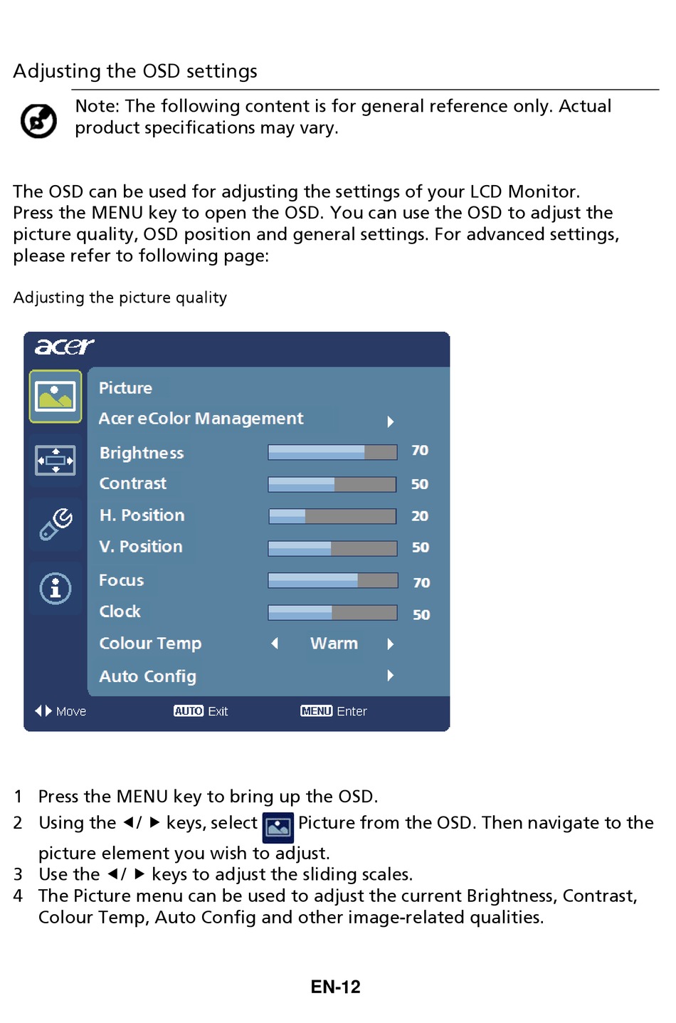 picture quality, OSD position and general settings. For advanced settings,