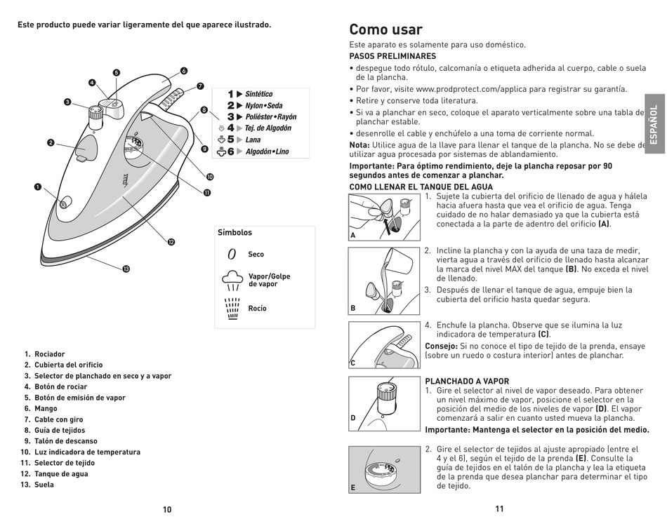 nota: Utilice agua de la llave para llenar el tanque de la plancha. No se debe de