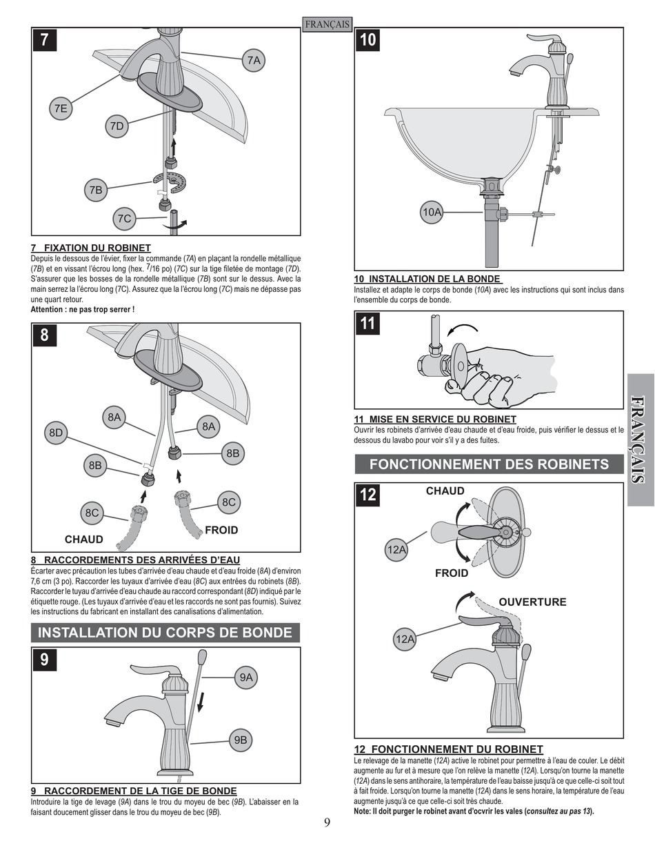 7,6 cm (3 po). Raccorder les tuyaux d'arrivée d'eau (8C) aux entrées du robinets (8B).