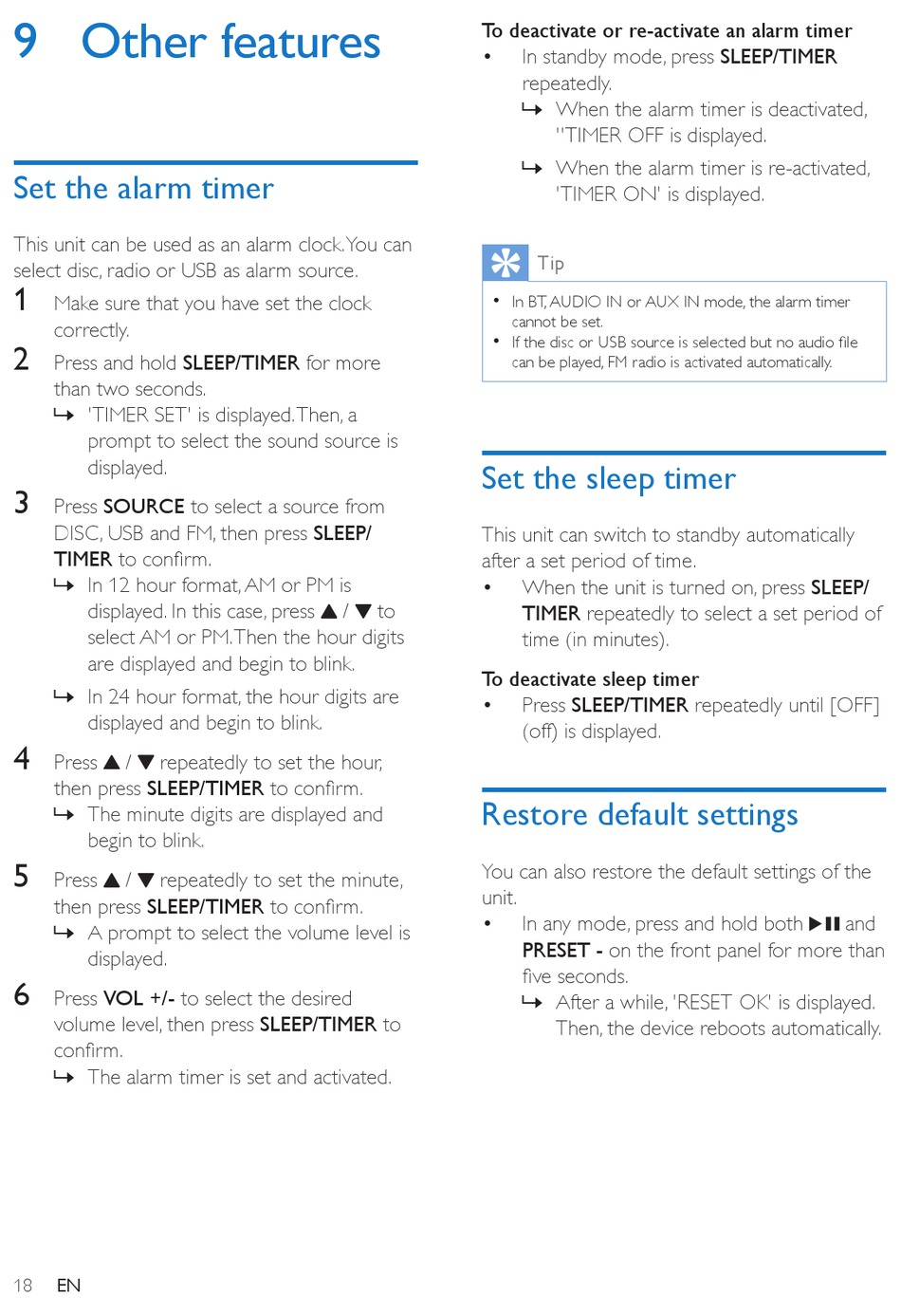 Press and hold SLEEP/TIMER for more
