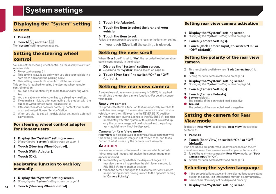 Setting rear view camera activation on page 14