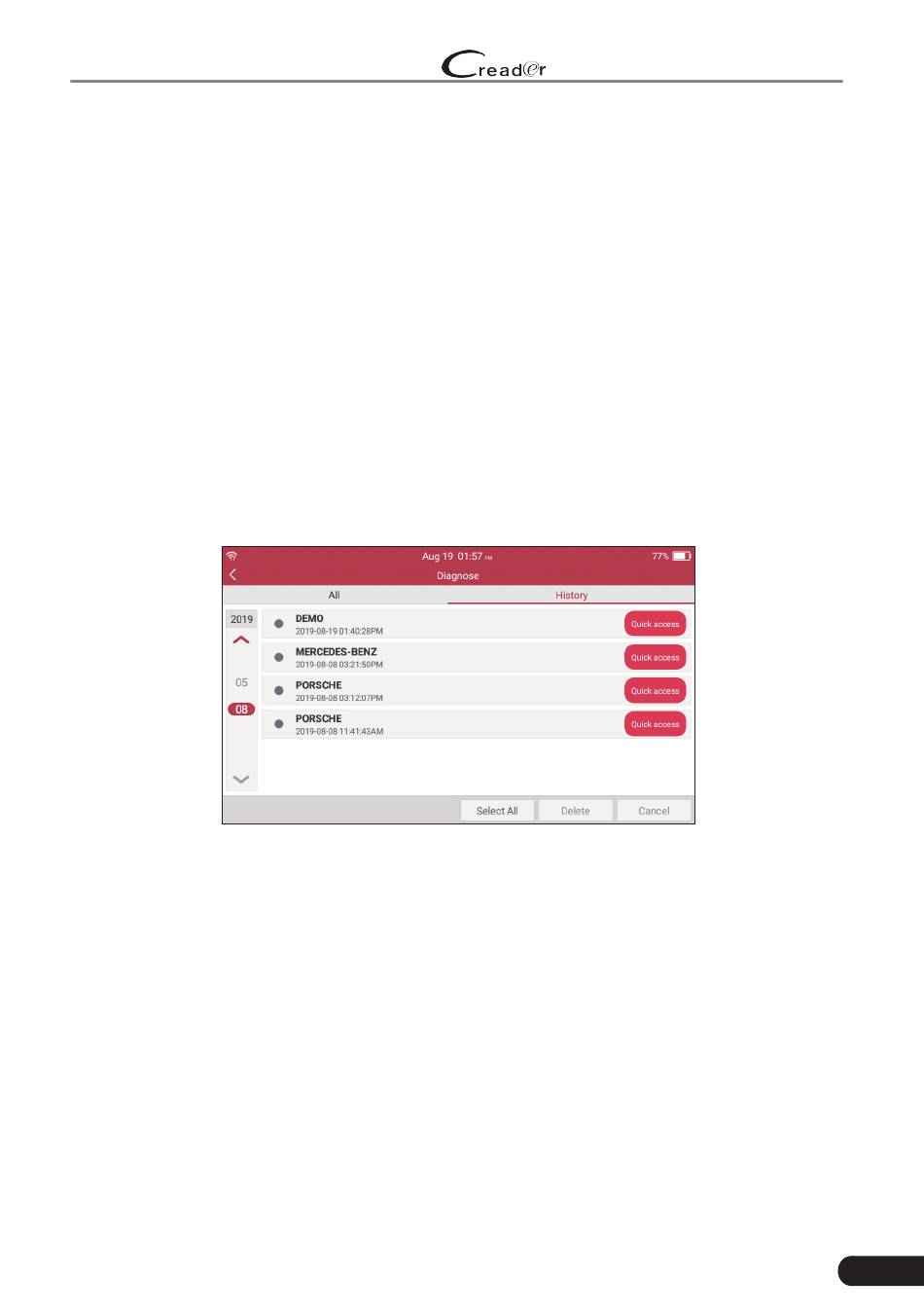 Tap "History" on the Manual Diagnosis main menu screen, all diagnostic records