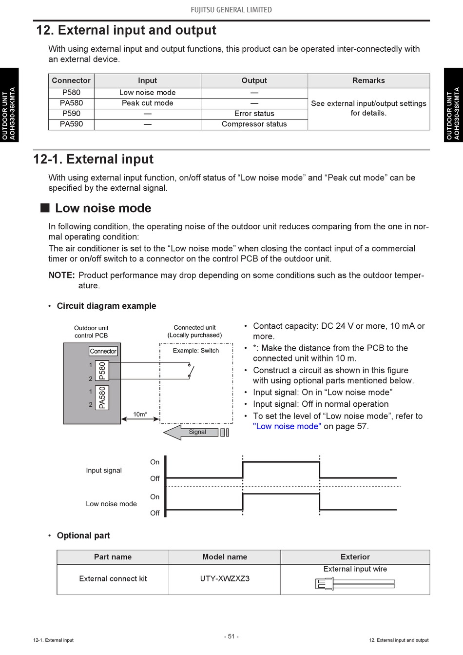The air conditioner is set to the "Low noise mode" when closing the contact input of a commercial