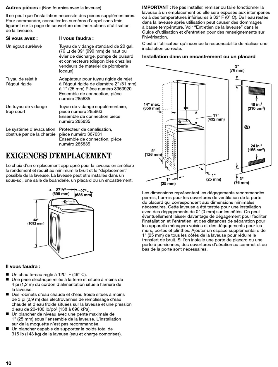 nécessaires. Cette laveuse a été testée pour une installation