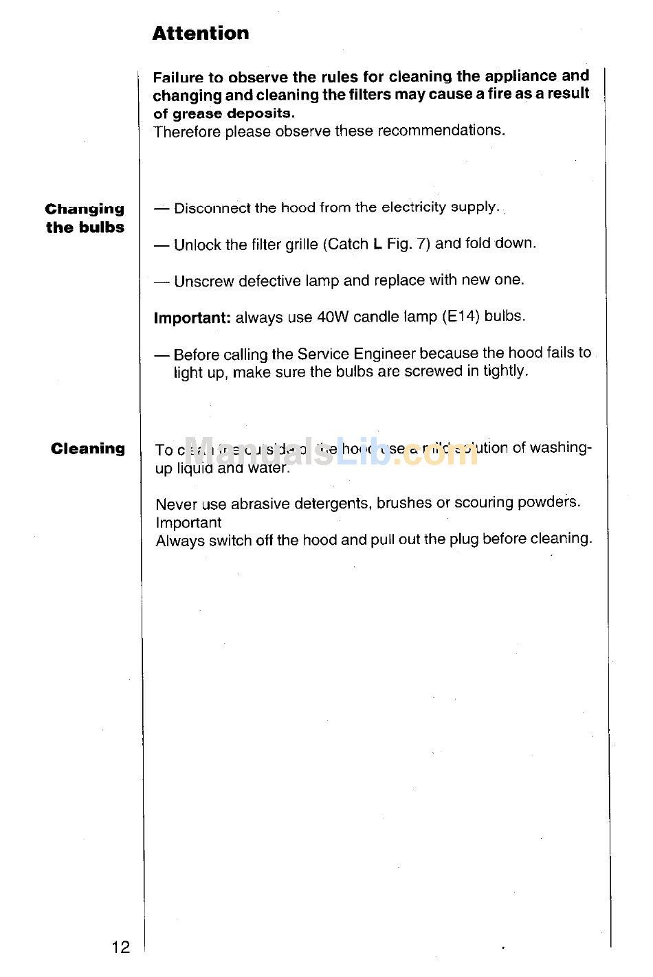 Attention; Changing The Bulbs; Cleaning - Aeg 102 D Installation And Operating Instructions Manual