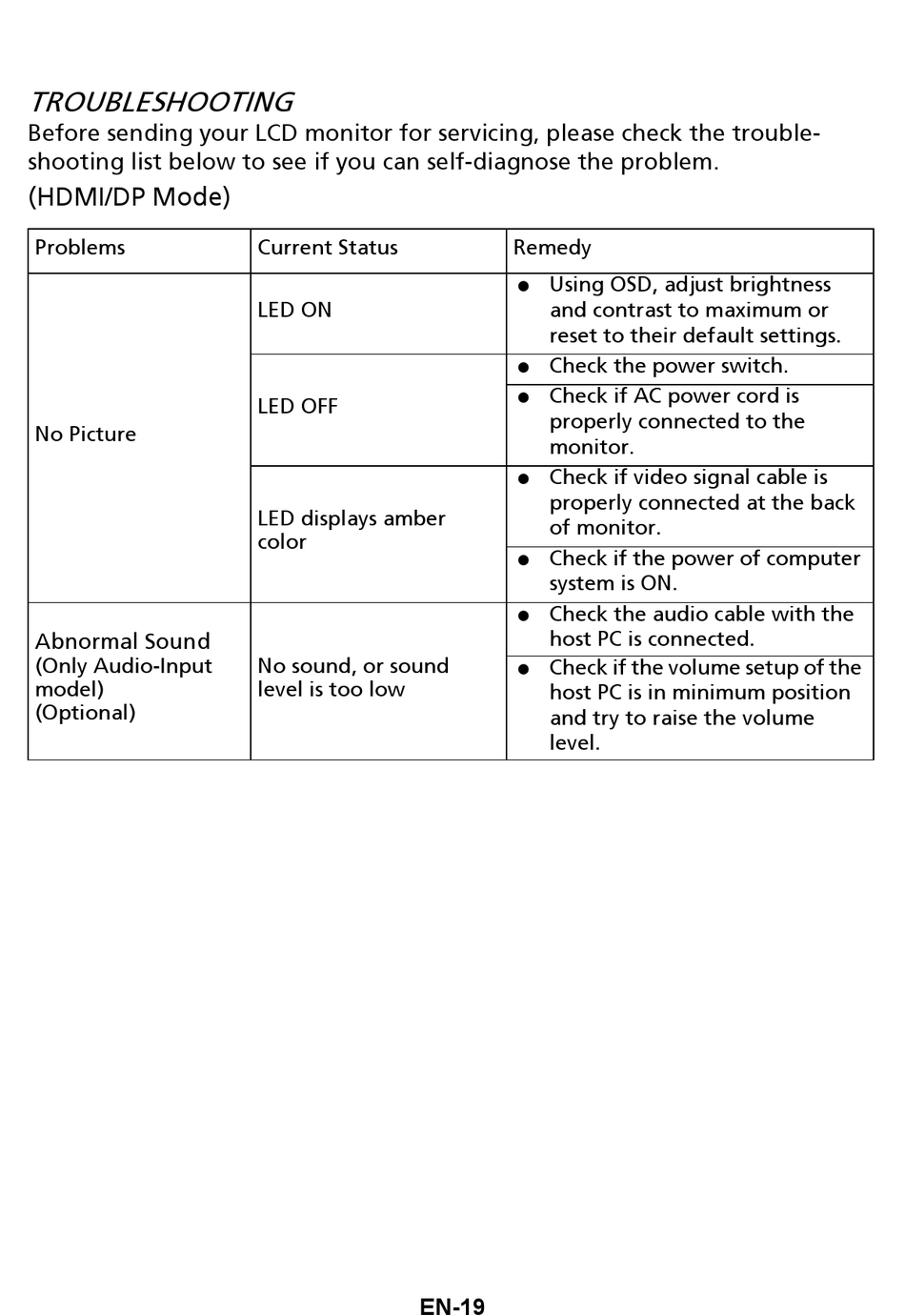 Before sending your LCD monitor for servicing, please check the trouble-