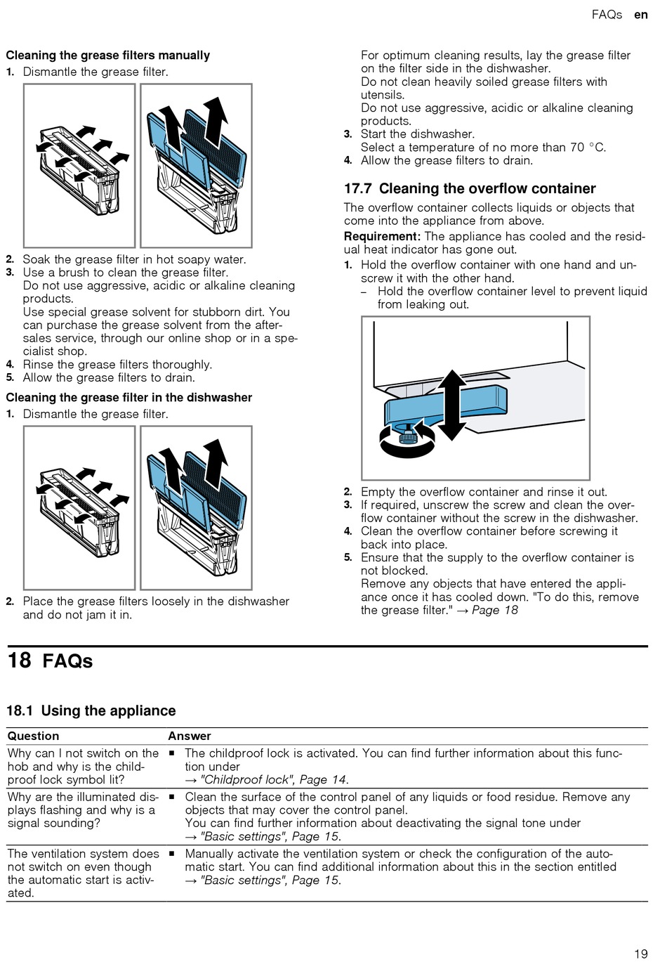 the grease filter." → Page 18