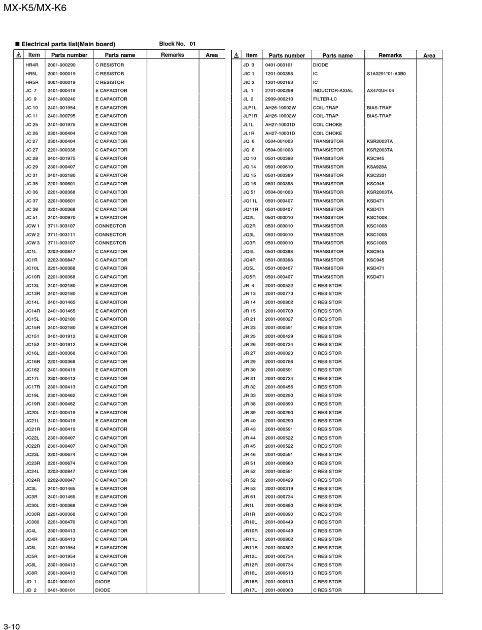 Electrical parts list(Main board)