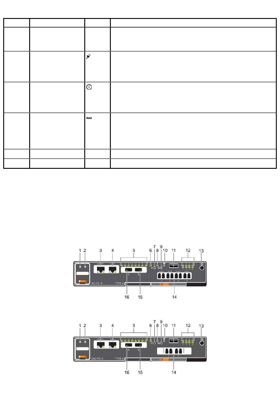 The following figures show the features and indicators on a storage controller with Fibre Channel front-end ports.