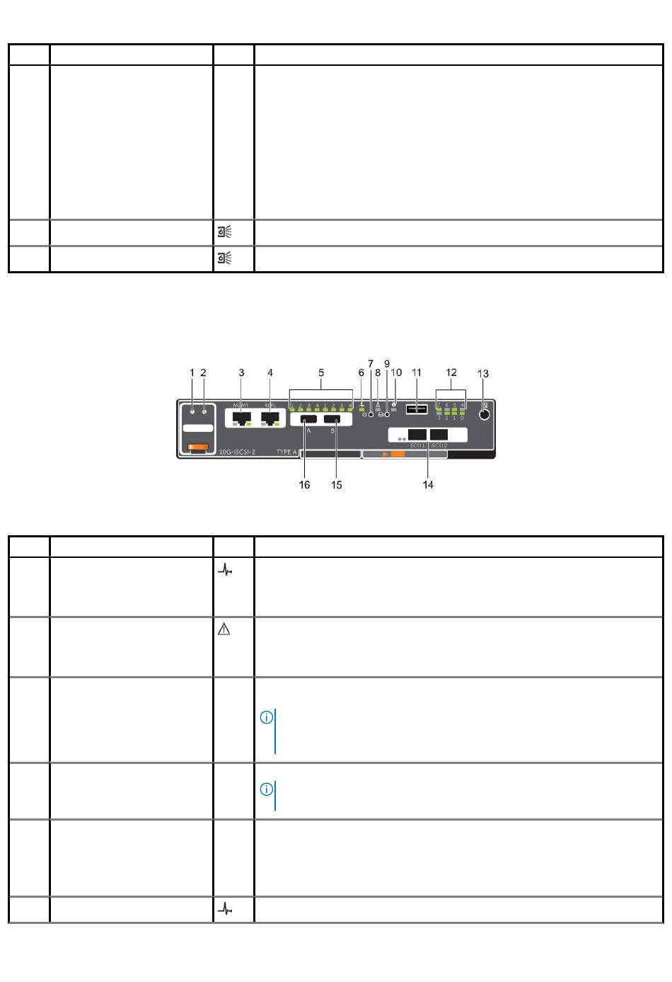 The following figure shows the features and indicators on a storage controller with iSCSI front-end ports.