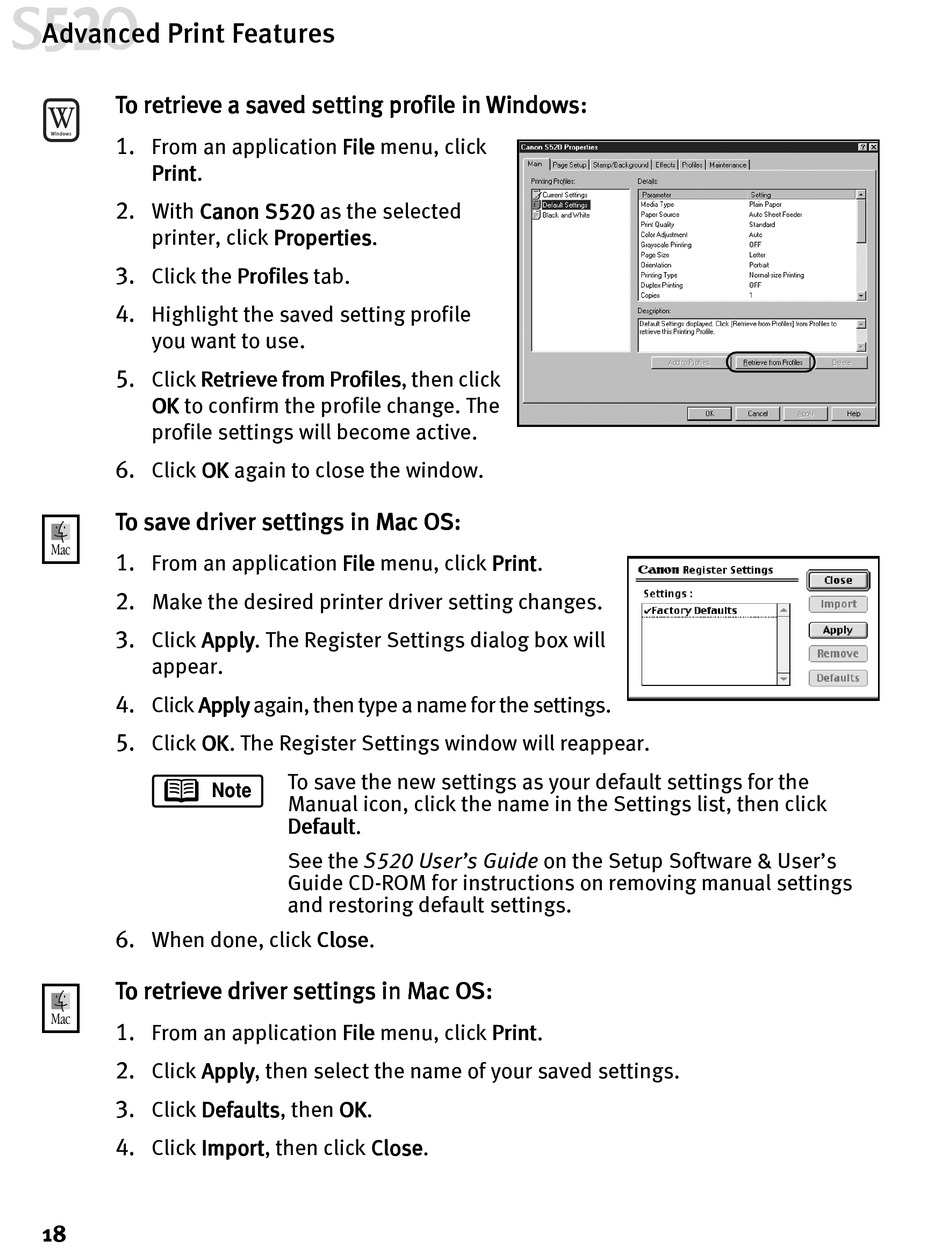 To retrieve a saved setting profile in Windows: