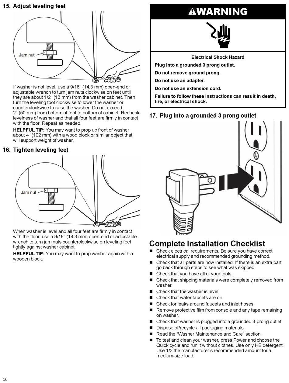 If washer is not level, use a 9/16" (14.3 mm) open-end or