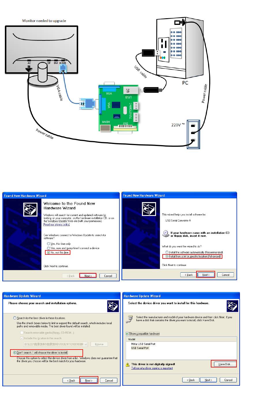 3.1. When insert the USB cable to PC USB port, will pop up a Hardware Wizard to help you install the USB driver if you