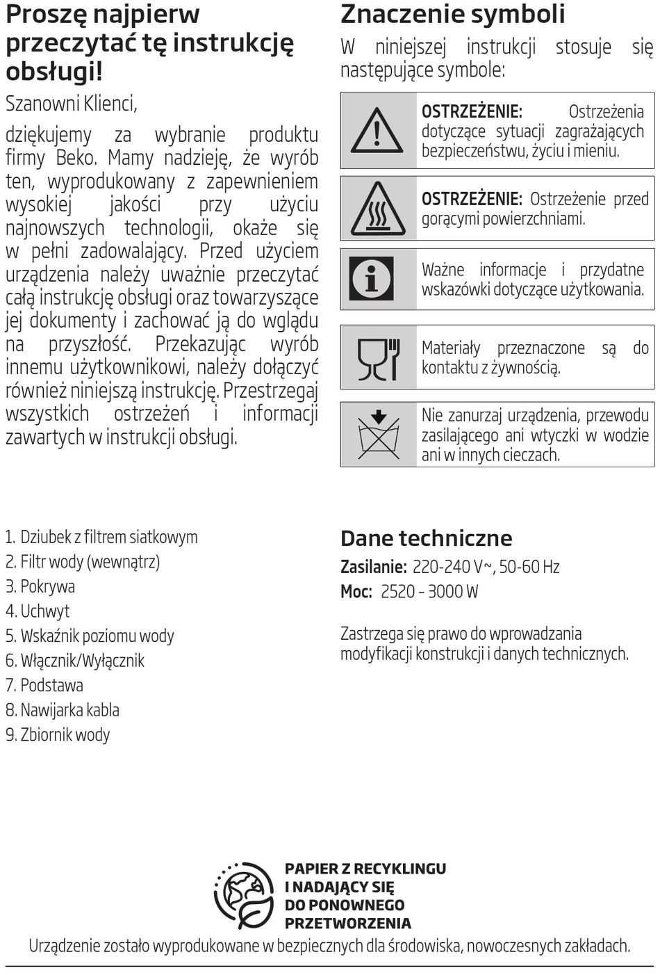 Zasilanie: 220-240 V~, 50-60 Hz