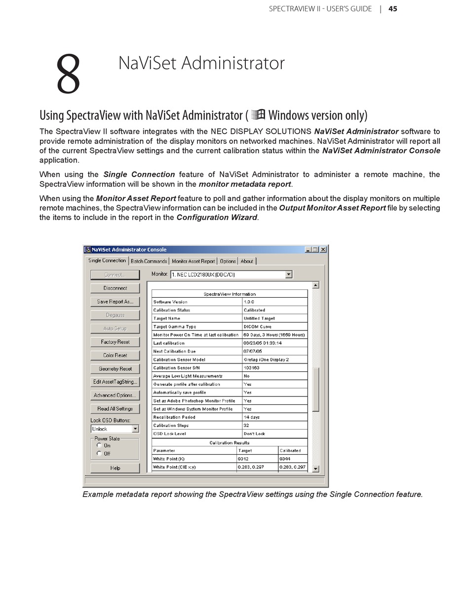 of the current SpectraView settings and the current calibration status within the NaViSet Administrator Console