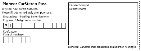 | Manufacturer: Pioneer Corporation 28-8, Honkomagome 2-chome, Bunkyo-ku, Tokyo 113-0021, JAPAN | EU Representative's & Importer: Pioneer Europe NV Haven 1087,Keetberglaan 1, 9120 Melsele, Belgium ttp://www.pioneer-car.eu |