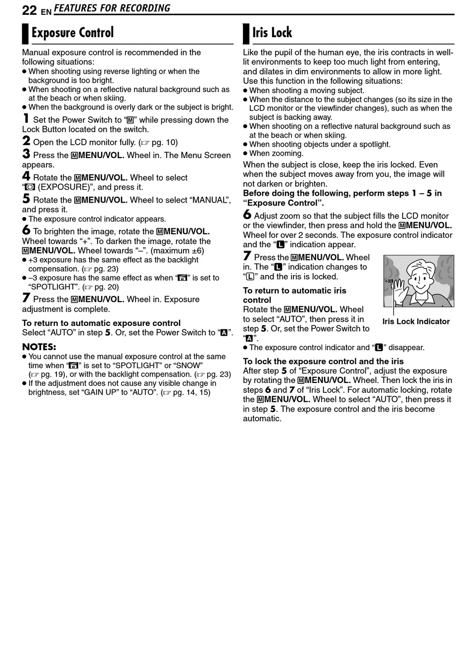 by rotating the MMENU/VOL. Wheel. Then lock the iris in