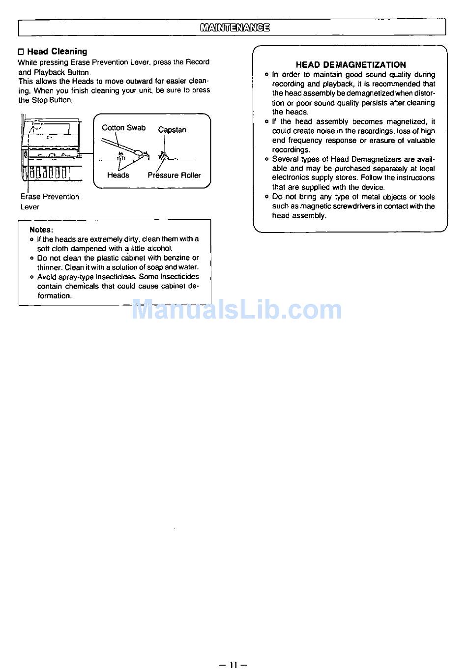 Maintenance; Head Cleaning; Head Demagnetization - Panasonic Rr-830 Operating Instructions Manual