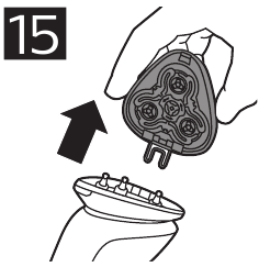 - Press the shaving unit release button to open the shaving unit. Pull the shaving unit off the appliance (Fig. 15).