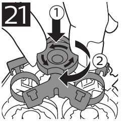 - Put the retaining frame back into the shaving unit (1) and turn the lock clockwise (Fig. 21) (2).