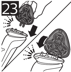 - Insert the lug of the shaving unit into the slot in the top of the appliance. Then close the shaving unit (Fig. 23) ('click').