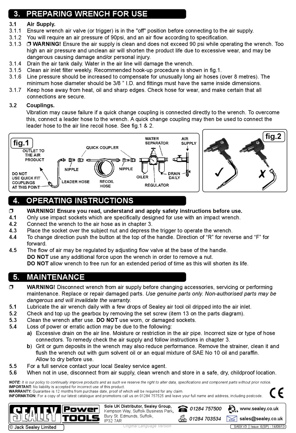 3.1.4 Drain the air tank daily. Water in the air line will damage the wrench.