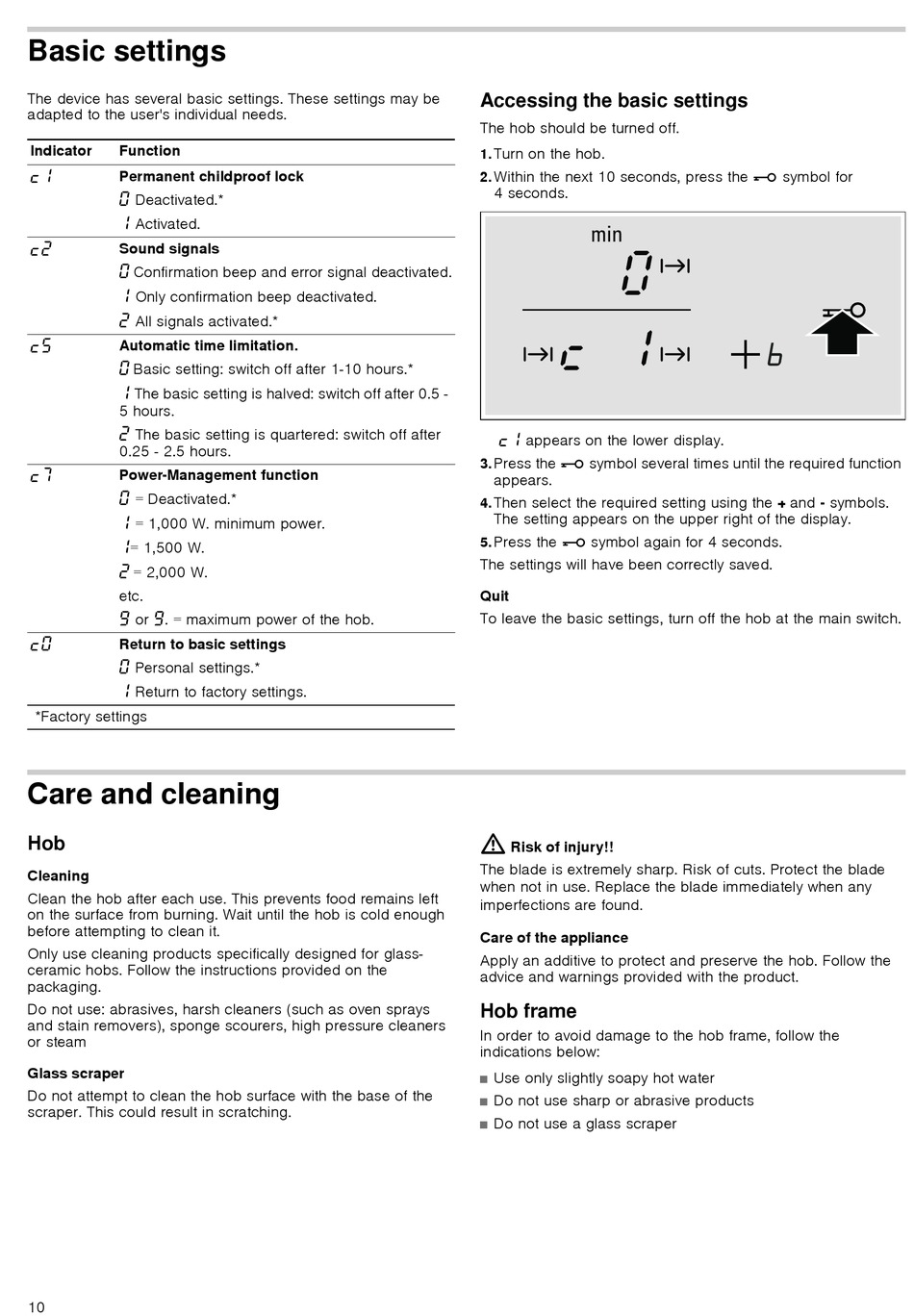 To leave the basic settings, turn off the hob at the main switch.