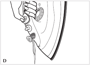 - Empty the water by holding the iron over a sink with the tip pointing down. Water will empty out of water-fill opening (D).
