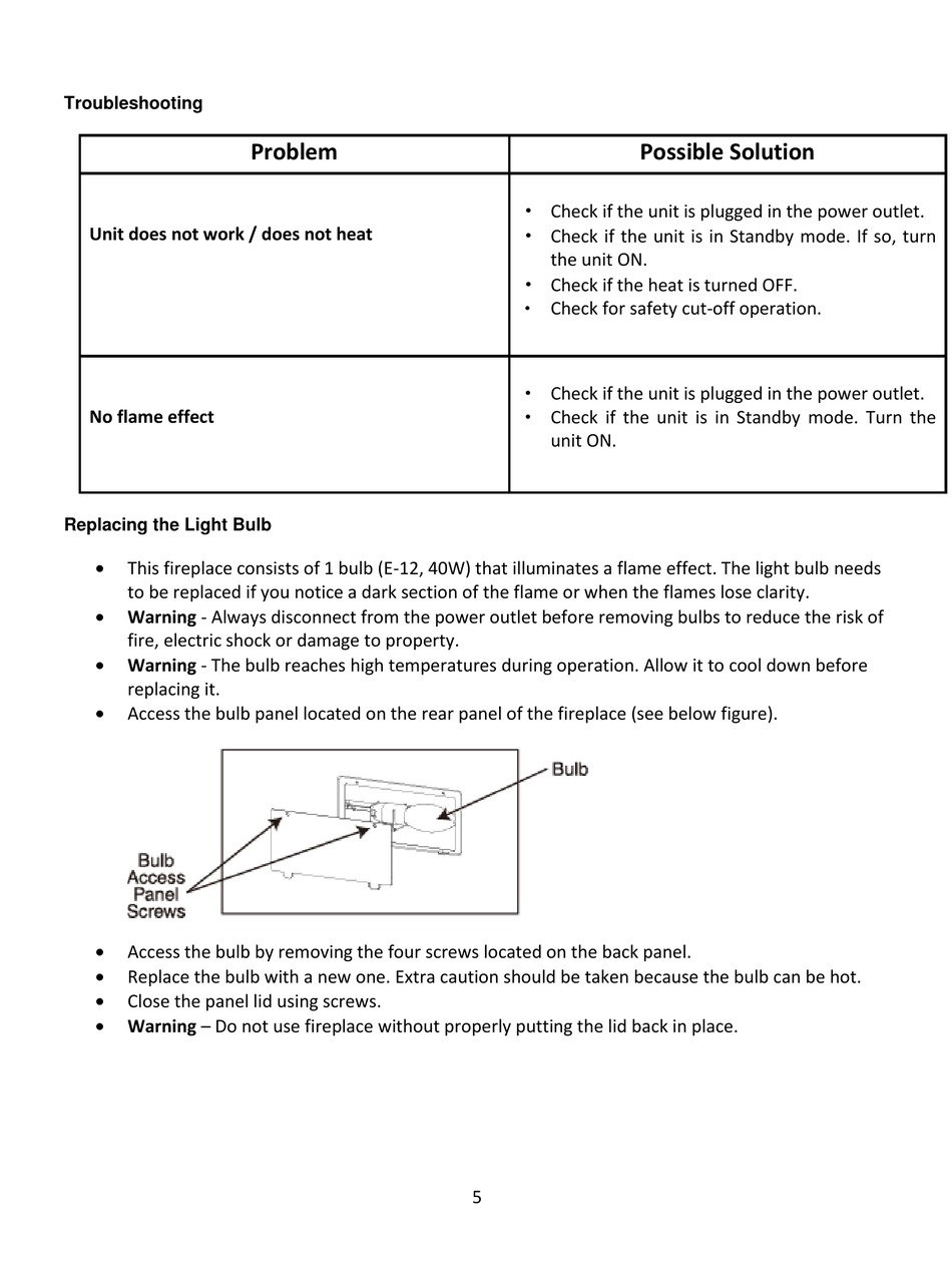 This fireplace consists of 1 bulb (E-12, 40W) that illuminates a flame effect. The light bulb needs