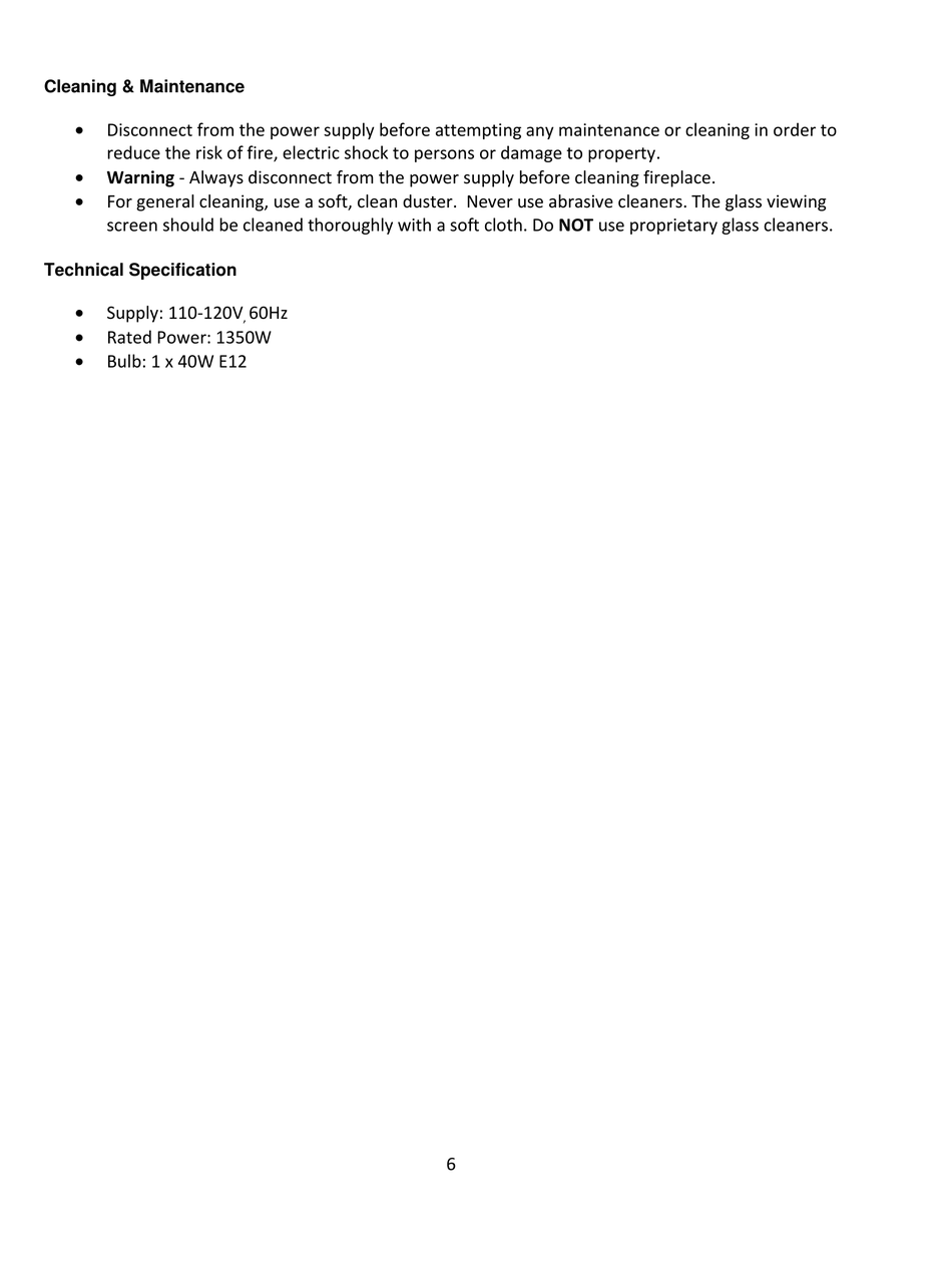 Warning - Always disconnect from the power supply before cleaning fireplace.