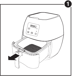 After you have selected your cooking time and temperature and you are ready to add your ingredients to the NuWave Brio Digital Air Fryer: Pull out the Base Tray and Fry Pan Basket from the NuWave Brio Digital Air Fryer. (Fig. 1)