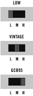 - Internal VOICING switch allows you to change the frequency range of the CBM95. To access, remove bottom plate. Default setting is H—High, for the standard GCB95 sound. For a more vintage, midrange-focused sound, set the switch to M. For a lower frequency range, select L.