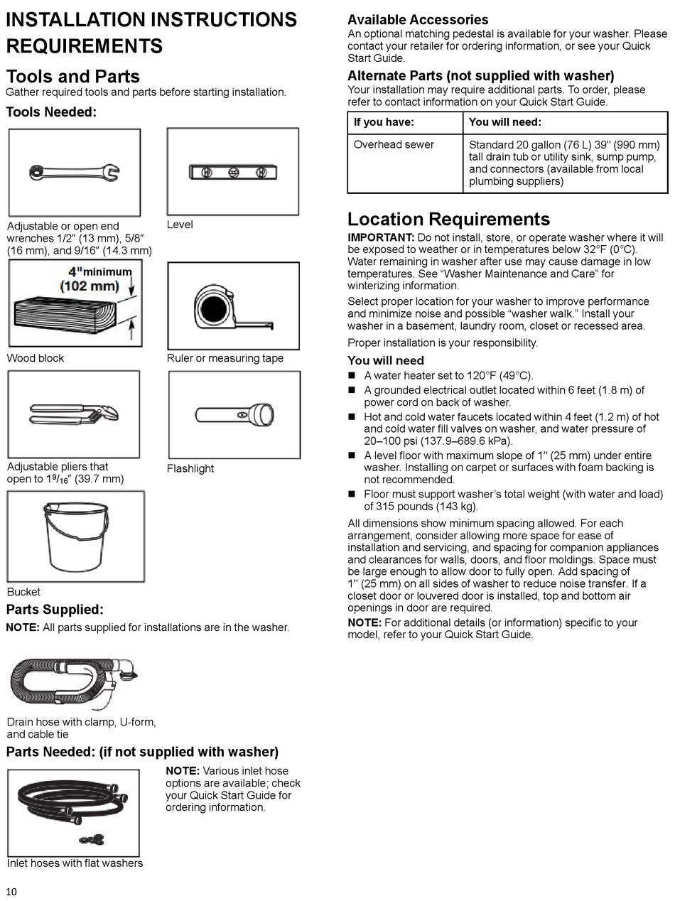 1" (25 mm) on all sides of washer to reduce noise transfer. If a