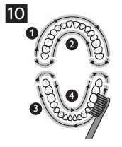 - Begin brushing in section 1 (outside top teeth). A short series of tunes indicate it is time to move to section 2 (inside top teeth). At the next series of tunes, move to section 3 (outside bottom teeth). The next series of tunes indicate it is time to move to section 4 (inside bottom teeth). The toothbrush will automatically turn off at end of the brushing cycle (Fig. 10). Your Sonicare is safe to use on: